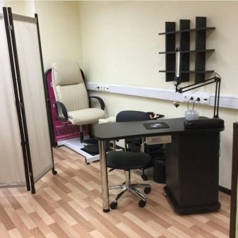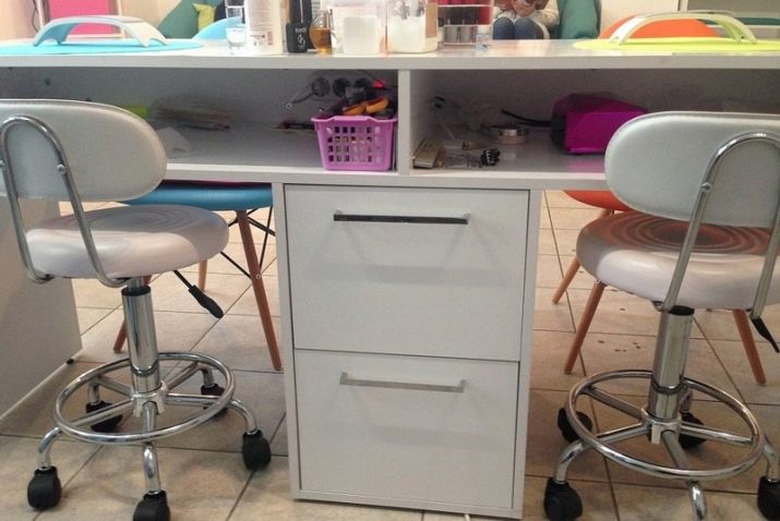 Inoltre, in alcuni studi di manicure, vengono utilizzati comodi controsoffitti di grandi dimensioni per 2 posti di lavoro: a un tavolo del genere puoi fare la manicure con un amico. Ogni maestro avrà il suo piedistallo e la sua superficie di lavoro.