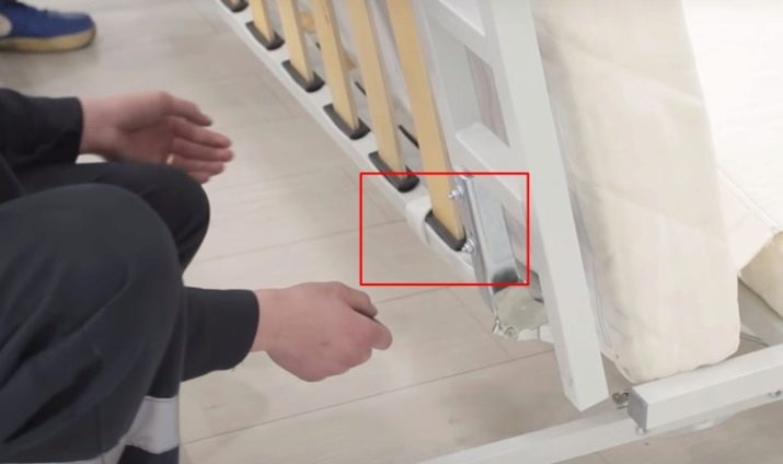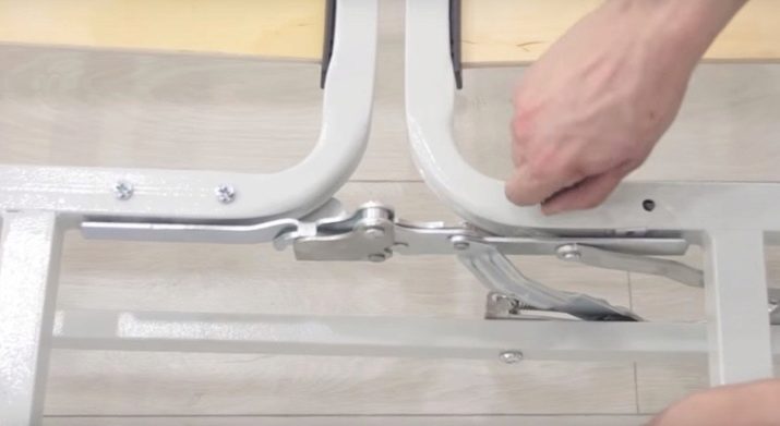 - 3 ° passo. I meccanismi stessi che sollevano la parte posteriore del divano devono essere fissati all'interno dei montanti laterali. La piattaforma del meccanismo dovrebbe trovarsi in alto. Il fissaggio viene effettuato mediante bulloni mediante rondelle e dadi.