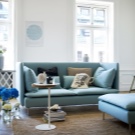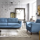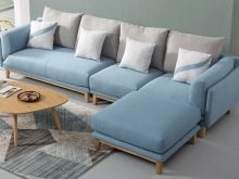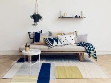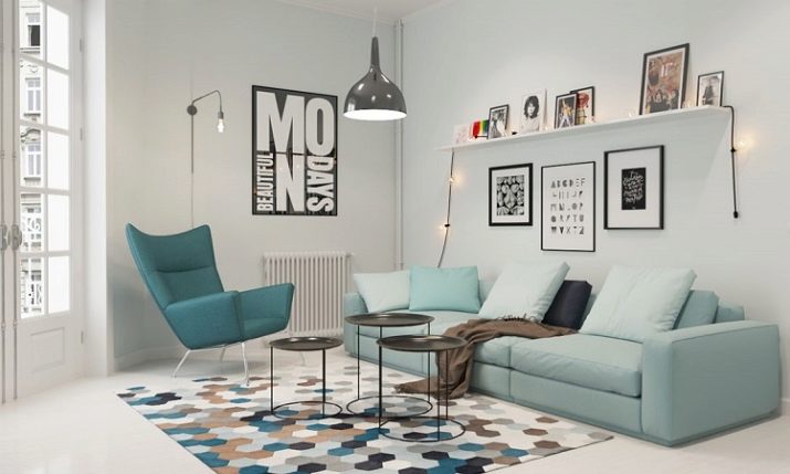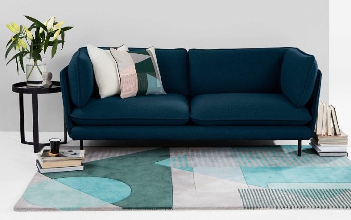 Si inserisce con successo all'interno in stile scandinavo e divano in blu o blu. Ad esempio, puoi porre l'accento principale nella stanza sul divano. Quindi le pareti, il pavimento e altri mobili dovrebbero essere realizzati in colori neutri.