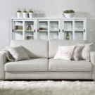 Se scegli mobili di questa tonalità, puoi mettere in risalto con successo altri oggetti interni. E per aggiungere un po 'di gioco, puoi posizionare sul divano cuscini di colori accenti: verde, blu o blu. Si adatta perfettamente allo stile nordico e alle tonalità chiare del divano. Questa può essere qualsiasi variazione dei colori beige. I colori lattiginosi si combinano con successo con quelli vicini al marrone, così come con il blu, il grigio scuro.