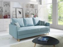 Il divano è la figura principale in ogni salotto, quindi in stile scandinavo non viene meno attenta. La caratteristica principale di un tale divano è la semplicità. Le tonalità più popolari per i rivestimenti - grigio o blu - conferiscono al mobile un suo carattere, che lo rende invisibile tra gli altri o lo pone al centro della collezione di mobili.