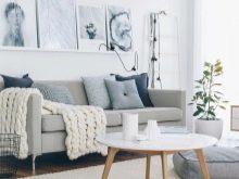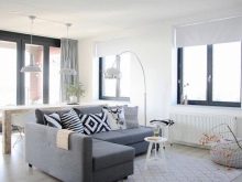- L'opzione più semplice, in cui sono presentate tutte le caratteristiche dello stile scandinavo. Un divano grigio su uno sfondo bianco con l'aggiunta di cuscini luminosi sembra fantastico.
