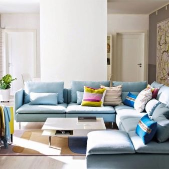 - L'enorme divano ad angolo in blu è completato con successo da cuscini luminosi. Molto probabilmente, i designer hanno cercato di mescolare stili moderni e scandinavi.