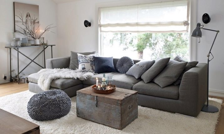 - I cuscini scuri decorano il divano ad angolo con cuscini scuri, ma su uno sfondo chiaro tutto ciò acquisisce un'incredibile armonia. Gli elementi decorativi corrispondono allo stile scandinavo.
