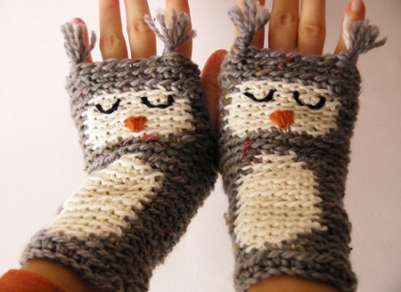 Un'altra direzione di tendenza per i guanti a maglia è l'uso di animali a maglia come decorazione. Ad esempio, i guanti beige con gufi, in cui sono cuciti bottoni al posto degli occhi, sembrano interessanti e insoliti. Tali modelli si rivolgeranno a bambini e ragazze che sono anche parziali a vari accessori carini e originali.
