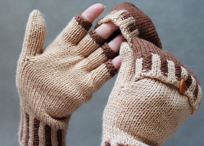Gli appassionati di calore e comfort dovrebbero prestare attenzione ai guanti del trasformatore. Questo modello combina le funzioni di guanti e guanti. Se necessario, la parte superiore che copre le dita, che di solito è fissata con un pulsante, può essere ripiegata e le dita aperte. I più comuni modelli di trasformatori a maglia, ci sono anche casi di maglieria.