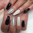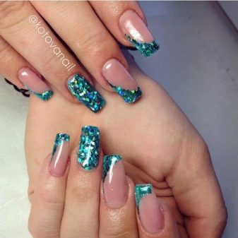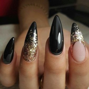 A proposito, l'aggiunta di un luccichio è molto popolare oggi e puoi combinare allo stesso tempo polline perlato fine e grandi scintille nel design. È di moda coprire la base nera con scintillii, creando così l'effetto di preziosa spruzzatura di singoli disegni.