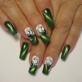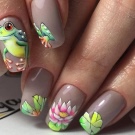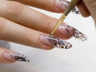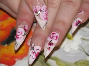 Il modo più costoso per decorare la superficie piana delle unghie estese è dipinto a mano. Può essere fatto in diversi modi (con la pittura ad acquerello, la tecnica di una singola pennellata, il metodo di disegno su una base bagnata o usando vernici con un effetto di fioritura). Questa decorazione delle unghie è piuttosto laboriosa e richiede un costante addestramento su speciali carte di allenamento, che vengono utilizzate dai maestri per affinare le loro abilità artistiche.