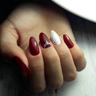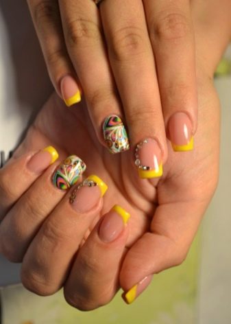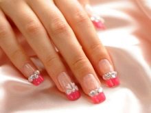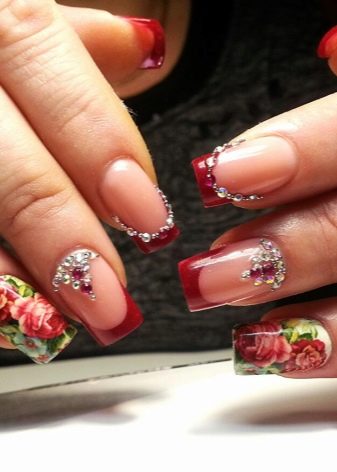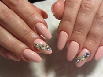 Una manicure con strass o altri intarsi è meglio usata come sostituto di piccoli fiori, foglie, gocce di rugiada, bagliore sulle ali di una farfalla, grani appuntiti e singoli elementi di monogrammi.