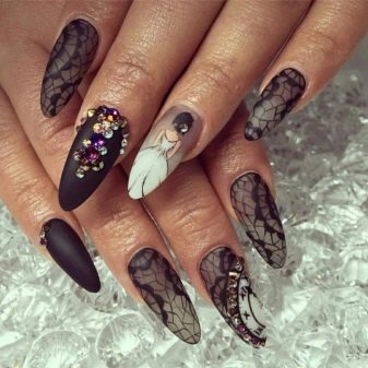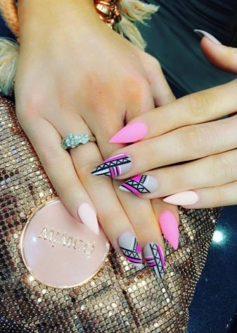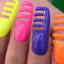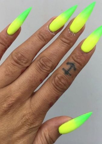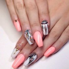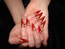 Le personalità oltraggiose possono permettersi soluzioni creative. Le loro mani possono essere decorate non solo con vivaci tonalità di vernice, ma anche con una forma insolita di unghie. Ad esempio, l'ultramodice può distinguersi con una manicure con unghie, denti, unghie, pugnali, altalene. A volte la forma sembra essere abbastanza ragionevole, ma l'arredamento ti fa girare di volta in volta per capire ciò che la sua padrona gli piaceva così tanto. Tali ragazze possono incollare sulle loro unghie uno strumento di modellazione a forma di naso con baffi, facce con capelli, pezzi di pelliccia, piccoli pompon e persino LED.