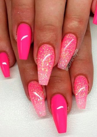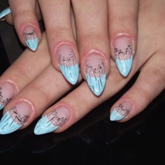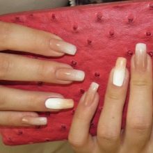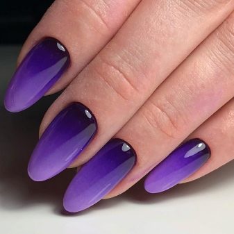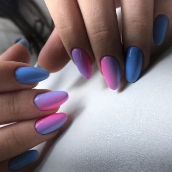 È possibile eseguire una sfumatura in due direzioni. Ad esempio, la base può essere un tratto regolare dal basso verso l'alto e una striscia verticale viene eseguita su di essa e viene creata un'ombra inversa su di essa. Se allo stesso tempo decora lo strato superiore con polvere acrilica, ottieni un design voluminoso nello spirito dell'ultima moda. Se vuoi novità, puoi eseguire una sfumatura da dito a dito usando sfumature correlate dello stesso colore. Un design con un tratto multicolore di tonalità pastello sarà anche bello.