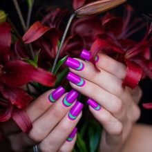 Tra i colori vivaci vale la pena notare fucsia, blu e rosso. Per il design autunnale, scegli arancione, giallo saturo e limone, in inverno devi prestare attenzione al colore marrone e all'ombra dell'onda del mare. Tra gli altri colori, sono richiesti anche i colori al neon, che consentono di creare un design succoso di frutta. È lamponi luminosi, verde-giallo, viola brillante, acido-arancio. I toni luminosi e succosi delle verdure fresche sono molto popolari.