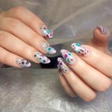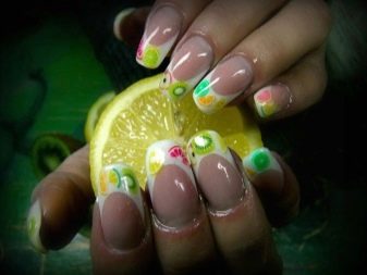 Per la decorazione estiva di unghie estese, puoi usare il fimo delle forme e dei colori più diversi. Questo decoro è composto da figure affettate da un bastoncino. Molto spesso si tratta di frutti e bacche che adornano le unghie artificiali dopo aver applicato un rivestimento ibrido e uno strato sigillante. Il materiale non è il più pratico, ma spettacolare e memorabile.