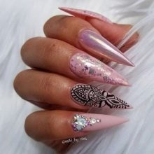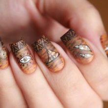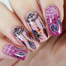 Lo stile Boho nel design per manicure sta guadagnando popolarità. Sulle unghie estese c'è abbastanza spazio per la disposizione di ornamenti luminosi inerenti a questo stile. Le stampe sono disegnate con un pennello sottile, il timbro viene utilizzato per crearle, dipingendolo, simulando un effetto vetrate.