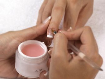 L'estensione viene eseguita dopo la rimozione del vecchio rivestimento e la preparazione delle unghie, poiché senza lucidare il materiale sulle sue unghie non sarà in grado di trattenere bene.A causa della lunghezza delle unghie estese, l'area sotto il design aumenta, il che significa che sorgono opportunità per la scelta di una stampa e vari decori che non possono essere permessi su unghie troppo corte e strette.
