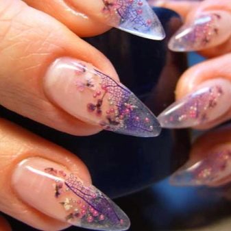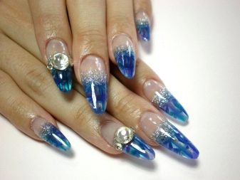 Una delle più interessanti tecniche di progettazione delle unghie per estensione è il design dell'acquario. È creato per mezzo di una sostanza modellante e sigilla anche l'arredamento all'interno delle unghie. Questa manicure ha un aspetto chic e voluminoso. A causa della lunghezza di tali chiodi, è possibile eseguire non solo singoli schizzi, ma anche intere composizioni. La sigillatura all'interno della struttura può essere fiori secchi, piccoli gusci, coriandoli, design a scorrimento, piccoli insetti e persino sabbia ordinaria.