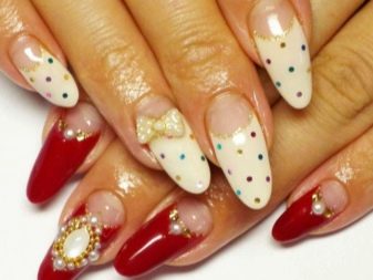 Gli appassionati di immagini luminose raramente passano per le ricche sfumature di rivestimenti e decorazioni accattivanti. Il loro arco può ad esempio adornare un disegno in contrasto rosso-bianco o rosso-oro. Allo stesso tempo, il tema del design alla moda può essere pizzo, geometrico o romantico. Inoltre, sono richieste composizioni sul tema della costa del mare e del glamour. La manicure di tali fashioniste può essere decorata con accenti con corone dorate, labbra rosse e bellezze civettuole.