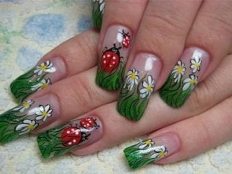 L'estate è un'ottima occasione per farti piacere con un design con motivi floreali e tutti i tipi di vegetazione. Ad esempio, data la rilevanza delle sfumature verdi, puoi decorare il set estivo di un fashionista urbano con un design con farfalle, libellule, coccinelle. È di moda disegnare denti di leone sulle unghie con ombrelli che volano nel vento. Denti di leone volumetrici, i cui ombrelli possono essere creati con un gel modellante trasparente, diventeranno anche una soluzione originale.