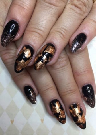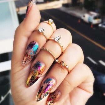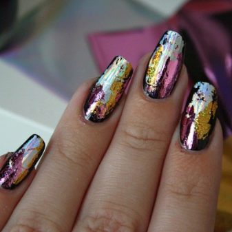Una delle novità della moda è la lamina di nastro. Questo materiale cresce gradualmente con le sue varietà, quindi puoi decorare la manicure con frammenti strappati di lamina, imitando polvere d'oro o d'argento o persino marmo. Inoltre, i nastri di alluminio possono avere un'ampia varietà di stampe, che ti permetteranno di creare manicure per vari scopi con il loro aiuto.
