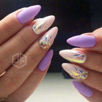 Il “vetro rotto” si distingue per un effetto insolito. Tale design viene spesso eseguito su unghie estese a causa della sua accattivante e novità. Crea il disegno tagliando e incollando i pezzi di pellicola per manicure con un effetto diverso (dall'olografia allo specchio). Il “vetro rotto” può diventare parte dell'immagine, una figura geometrica, un sorriso in una giacca, un'ala di farfalla, un petalo di fiore.