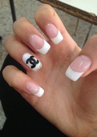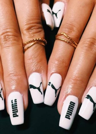 Logomania megaattuale. Questo disegno di unghie è scelto dai rappresentanti delle sottoculture giovanili. Il design con i loghi delle case di moda sembra elegante ed efficace. A volte uno di questi adesivi è sufficiente per fare in modo che una manicure solida acquisisca uno stato elevato.