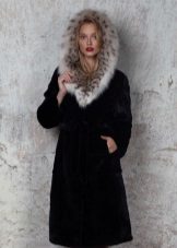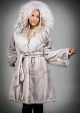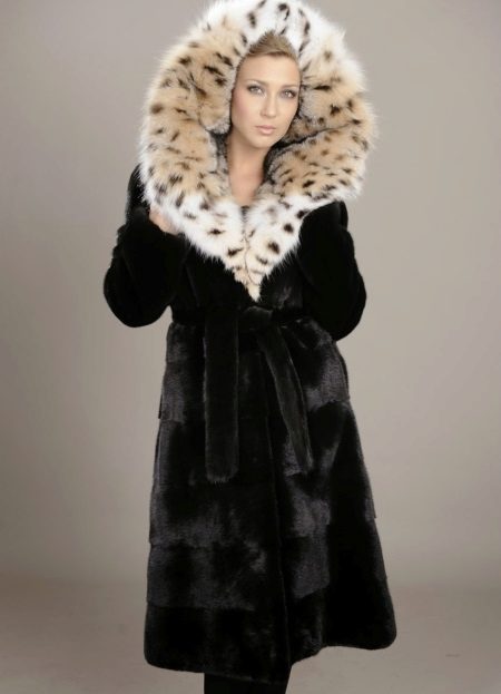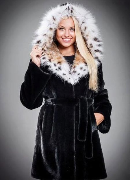 La seguente foto rappresenta un modello non meno spettacolare. Cappotto in visone tranciato con cappuccio in lince. La chiusura è rappresentata da una cintura di cuoio. Lo stile con coulisse ha trovato i suoi ammiratori ed è molto popolare tra le donne attive e le donne d'affari.
