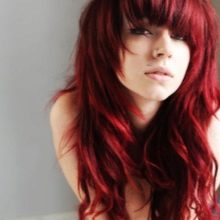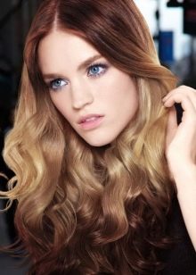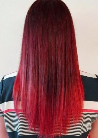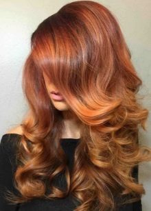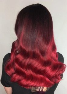 - Colorazione sfumata rossa. Il colore più brillante può anche essere variato aggiungendo sfumature e mezzitoni ad esso. Passando dalle radici chiare, l'ombra diventa più saturata alle estremità dei fili. Il gradiente rosso sui ricci lunghi sembra particolarmente impressionante.
