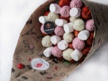 Se per qualche motivo alla ragazza del compleanno non piacciono i fiori o ha una reazione allergica, puoi comunque soddisfarla con un bellissimo bouquet, ma non del tutto normale. Recentemente, i mazzi di dolci, salsicce, formaggi, frutta secca e persino noci sono molto popolari.. Questa opzione regalo non sarà solo bella, ma anche molto gustosa, che non può che rallegrarsi.