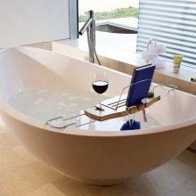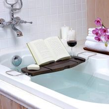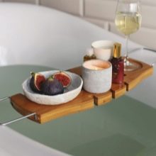 Puoi mettere un libro su di esso senza paura di bagnarti, installare un tablet per guardare il tuo film preferito o posizionare prodotti per la cura. Un tale supporto ha supporti rimovibili - ad esempio, sotto un bicchiere pieno con un drink.