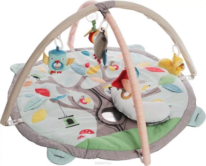 Un tappeto, una coperta calda o un materasso sottile in tessuto spesso decorato con disegni per bambini luminosi saranno interessanti per il bambino. Il set comprende tappetino con rivestimento in gommapiuma - "ponti" che vengono installati sul tappetino per appendere comodamente i sonagli.
