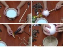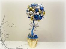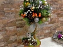 Una soluzione interessante potrebbe essere creazione di un arte topiaria di Capodanno, un candeliere decorato con fiori secchi e altri materiali naturali, nonché un albero di Natale decorativo. Per la produzione di arte topiaria di Capodanno non si può fare a meno di tinsel, dolci, scintillii, brandelli, nastri e giocattoli di Natale. Vale la pena eseguire passaggi come: