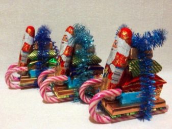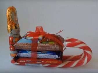 I dolci acquistati diventeranno la base per una presentazione interessante, se si progetta qualsiasi disegno natalizio da loro. Di materiali non commestibili avrai bisogno di una pistola per colla, nastro adesivo e un arco. Inoltre, non puoi fare a meno di dolci, barrette di cioccolato e caramelle al caramello. Il processo di fabbricazione comprende i seguenti passaggi: