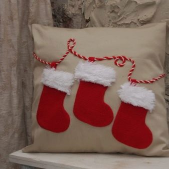 Anche i cuscini decorativi di Natale sembrano molto belli, creando intimità e umore in casa. Innanzitutto, il cuscino stesso può essere cucito da un vecchio plaid o maglione, e successivamente può essere decorato con decorazioni a tema.