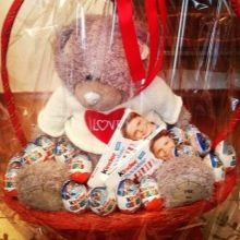 - Cioccolato - Questo prodotto è amato da adulti e bambini. Il cioccolato può essere dato in quasi ogni forma: può essere barrette di cioccolato, dolci, figure. La cosa principale è confezionare un regalo così bello.