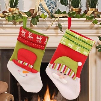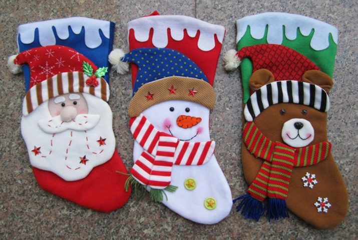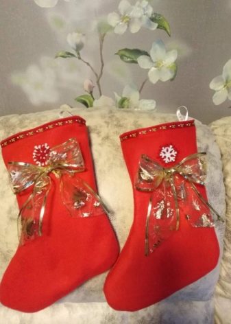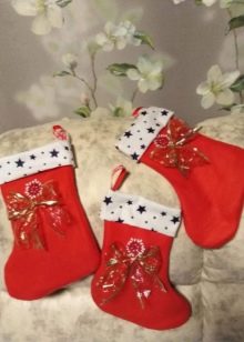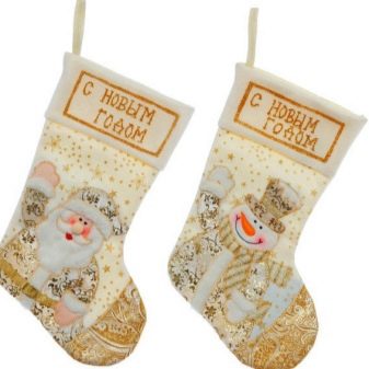 Esistono molti tipi di design per calze di Natale. Come opzione di decorazione, puoi persino usare calze o stivali di feltro regolari (un calzino improvvisato sembrerà molto originale). Puoi organizzare una cesta regalo così insolita sotto forma di stivali di Babbo Natale e Snow Maiden nello stile appropriato: dipingi con i fiocchi di neve sul tessuto usando coloranti (o ricamandoli con filo), ricamando con perline e paillettes. E per creare una frangia di pelliccia sintetica o lanugine di cigno.