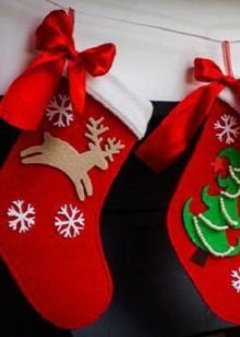 Le calze fatte di feltro sono abbastanza semplici da realizzare e sembreranno molto impressionanti. Inoltre, la scelta di questo materiale è dovuta anche al fatto che, a causa della sua densità, l'accessorio mantiene bene la sua forma e durerà a lungo, e l'arredamento può essere tagliato e cambiato in uno nuovo con l'avvento del prossimo anno. Per realizzare un prodotto in feltro, devi solo tagliare 2 parti identiche della calza e cucire le metà insieme usando una macchina da cucire o anche manualmente.