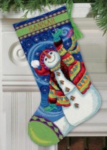 Un'opzione di ricamo classica è i fiocchi di neve. Utilizzando fili spessi o di lana, puoi ricamare lo stivale di Natale con fiocchi di neve e motivi in vari colori. I fili con lurex sono belli, così come i filati testurizzati. Le vere artigiane possono ricamare motivi più complessi, come un pupazzo di neve o un cervo.