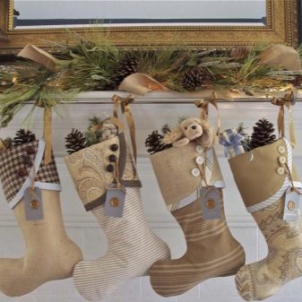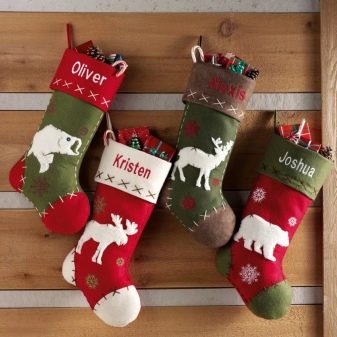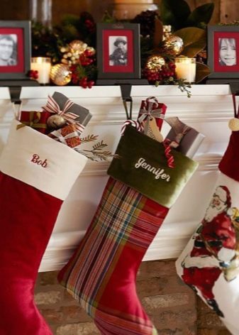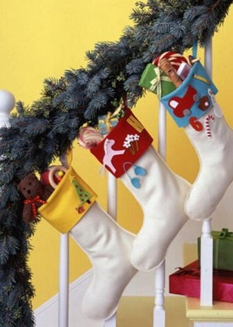 L'arredamento può anche differire dal concetto di posizionare le calze e da chi farai regali in modo così originale. Un'idea interessante per una famiglia numerosa sarà la produzione di diversi calzini di diverse dimensioni (ognuno avrà il suo). E il modo in cui ti piace fare la scritta "amato papà", "bambino d'oro", "nonna premurosa" o scrivere i nomi dei propri cari, su ogni dito del piede, e persino desideri.