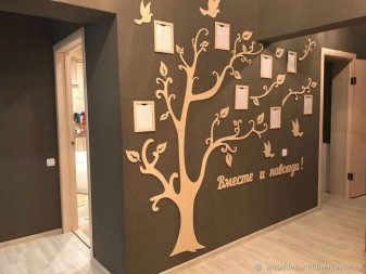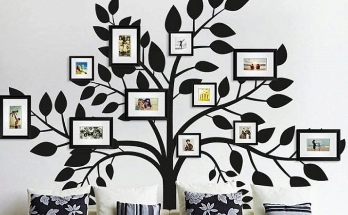 - Albero genealogico (familiare) con cornici in soggiorno. Servirà non solo come eccellente decorazione per la stanza, ma salverà anche informazioni sulle generazioni.Il colore dell'albero dovrebbe essere armoniosamente combinato con sfumature di mobili e decorazioni murali, pavimenti. Inoltre, puoi decorarlo con nastri e perline.