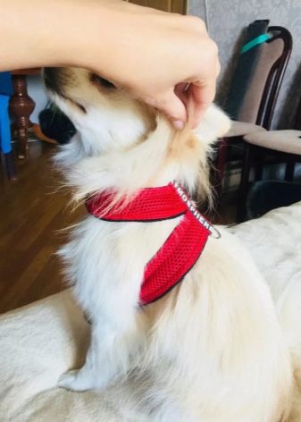 L'imbracatura per lo spitz non dovrebbe essere troppo sottile, il che può causare sensazioni spiacevoli e anche troppo spessa, che contribuirà a schiacciare i capelli e la formazione di chiazze calve.