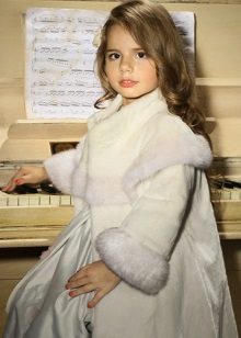 Una cosa del genere può essere decorata con pizzo, nastri di raso. Le ragazze anziane sembrano eleganti nei modelli allungati. Un cappotto di visone delicato e liscio è più probabilmente un'opzione per la pubblicazione con i genitori.