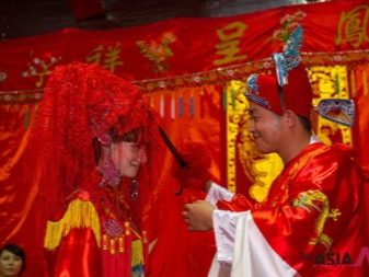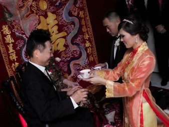 Il matrimonio tradizionale cinese dovrebbe essere tenuto in rosso. Cioè, l'abito della sposa, le scatole con i regali, le buste con i soldi dovrebbero essere rosse. Più colori brillanti ci saranno alla celebrazione, meglio è. Per tradizione, i giovani bevono da bicchieri collegati da un unico nastro rosso. Questo simboleggia i loro sentimenti reciproci e l'unità di una giovane famiglia.