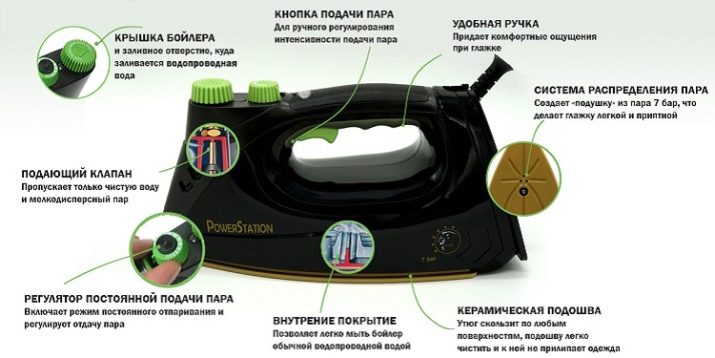 Il design del dispositivo ha un serbatoio integrato o separato con un elemento riscaldante. L'acqua dovrebbe essere versata al suo interno, che con l'aiuto dell'elettricità bollirà e presto si trasformerà in vapore. Ci sono piccoli fori nella suola del dispositivo che consentono al vapore di uscire e penetrare nelle fibre del tessuto, rendendolo uniforme.