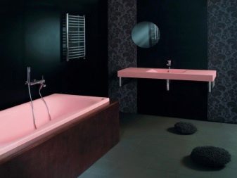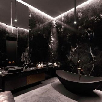 Un bagno nero è sempre eccentrico. Nonostante molte persone considerino questo colore cupo e completamente inadatto per il bagno, sta diventando sempre più popolare ogni giorno. Il motivo, molto probabilmente, risiede nella sua inusualità. Inoltre, il nero si fonde meravigliosamente con tutti i colori, in quanto è universale. Tuttavia, vale la pena notare che tali soluzioni sono adatte a grandi aree, poiché il nero nasconde lo spazio. Aspetto particolarmente interessante bagni scuri ovali e angolari.