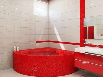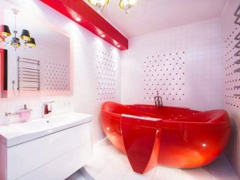 Un bagno completamente rosso con una piccola quantità di decorazioni rosa sarà bello, mentre è importante scegliere non il rosa tenue, ma il silenziato. Un morbido design rosa e talcato apparirà elegantemente in stanze rosse e sature.