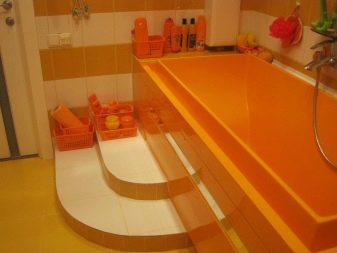 Giallo e arancione - questi sono colori che si fondono perfettamente insieme. Sono soleggiati, luminosi, energizzano, danno vigore per tutto il giorno. Nuotare in un bagno del genere è un piacere. In questo caso, puoi prendere un bagno giallo e combinarlo con un arredamento arancione nella stanza, oppure puoi fare esattamente il contrario. E puoi combinare con successo entrambi i colori, ad esempio il bagno stesso sarà giallo e il vassoio - arancione.