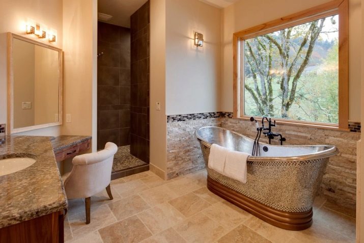 I colori marrone, beige e crema creano una sensazione di calore e intimità. Tali colori sono spesso scelti da persone con un gusto delicato. Una vasca marrone aggiungerà completezza alla stanza e aggiungerà romanticismo ad essa. In genere, le vasche da bagno di colori simili completano la finitura più chiara nei colori crema o pastello e aggiungono anche alcuni accenti luminosi dalla calda gamma di colori.