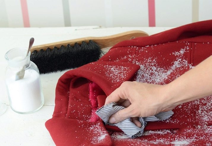 Lo sporco grave può anche essere rimosso a casa. Se il colletto, le tasche e i polsini sono molto grassi, è necessario preparare una miscela di sale e ammoniaca in un rapporto di 1: 4. Quindi è necessario inumidire la spugna in questa soluzione e pulire le aree lucide. Invece di sale, puoi usare aceto assunto in parti uguali con l'alcol.