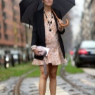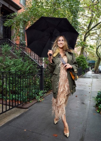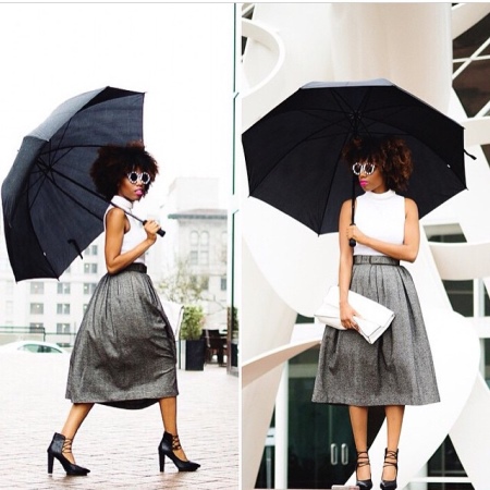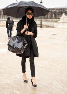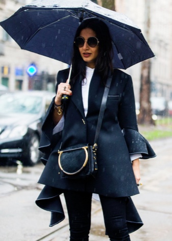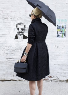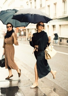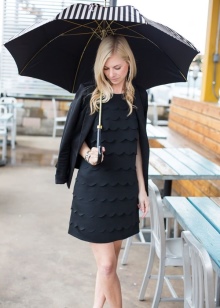 Puoi creare un look da sera chic con un abito femminile di media lunghezza o piano e un ombrello scuro. L'outfit può essere decorato con pizzi o volant flirty. Il colore può essere quasi qualsiasi: sia scuro che chiaro.