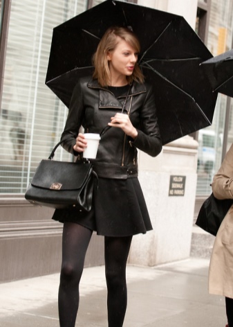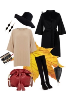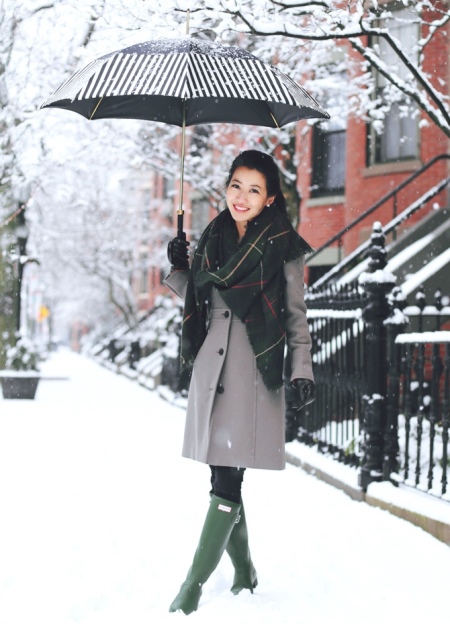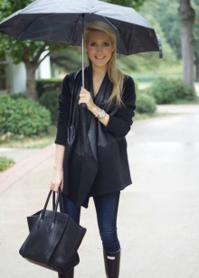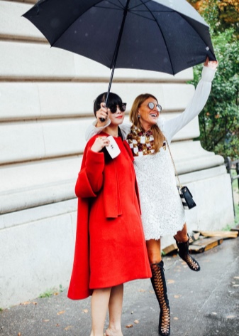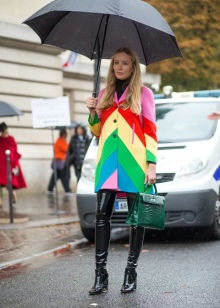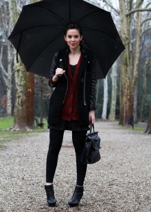 Il prodotto scuro apparirà spettacolare nell'insieme con abiti di bianco e rosso. Questo contrasto sembra succoso e spettacolare. Per la semipagina fangosa, puoi scegliere un cappotto dritto o aderente (o mantello) in colori vivaci. Puoi integrare l'immagine con un ombrello scuro e gli stessi stivali scuri.